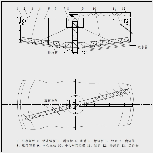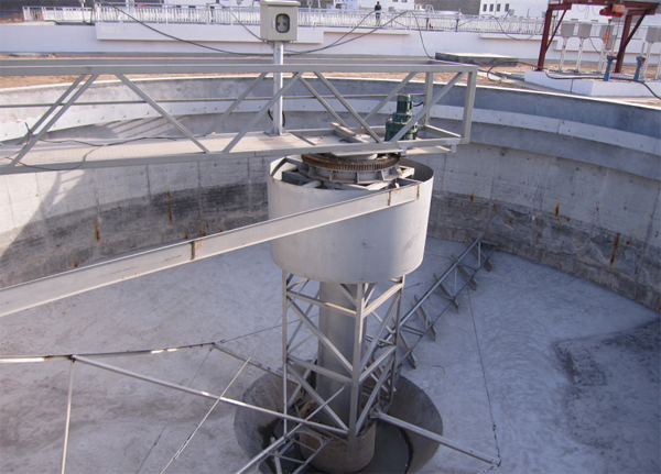 该设备采用中心传动、垂架式,污水从进水管流入导流筒扩散后,均匀的向周边呈辐射状流出,呈悬浮状的污泥经沉淀后沉积于池底,驱动装置带动中心竖架旋转,并带动刮臂及刮泥板转动,将污泥从池周刮向中心集泥槽后,靠池内静水压由排泥管排出池外。水面的浮渣通过撇渣装置撇向池边,再由刮渣耙刮进排渣斗内排出池外。而上清液则通过出水堰板溢入出水槽内排出。