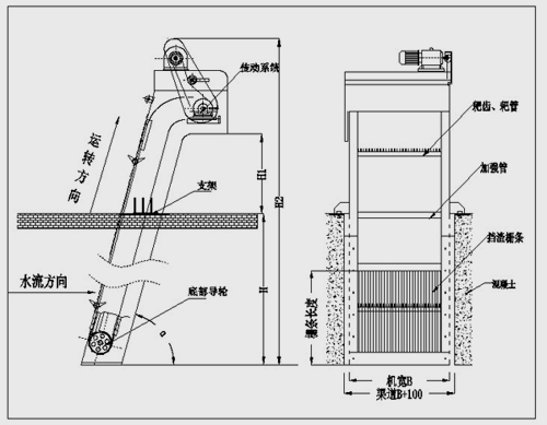 反捞式格栅除污机由机架、驱动装置、传动导轮、耙链组合及耙齿、挡渣栅条。挡渣板等组成。在电机驱动下,牵引链条在迎水面由下往上作回转运动。当牵引链上的耙齿轴运转到栅条的迎水面时。耙齿即插入栅条缝隙中由下往上作清捞动作,将栅条上所截留的杂物刮落耙中,清除效率高且彻底。当齿耙运转到机器上,杂物靠自重自行脱落至容器或输送机上,把杂物送走。