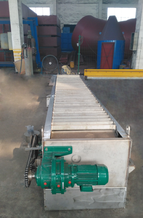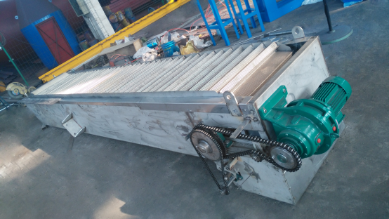 网板式阶梯格栅机的驱动装置位于机架上部,除传动装置外,其余均采用不锈钢材料制造。驱动装置采用轴装式减速机,在机架二侧设置螺旋式调节装置,以作调整传动链条张紧用。