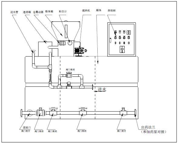 配制溶液从配制槽经熟化槽再进入储存槽,当储存槽液位处于高位时,配置过程自动停止,加药液过程继续,当溶液下降到中液位时,重新自动启动配料过程。配制槽和熟化槽均设置搅拌器,充分保证絮凝剂的稀释和熟化。另外,储存槽溶液不足时会触及下液位报警系统,所有系统均停止并报警。本装置是由具有自动化程度高、性能稳定、工作可靠、操作简单等特点。