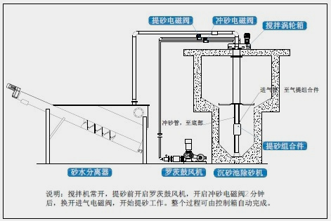 由于叶轮叶浆向上倾斜,旋转时将使池中的污水呈螺旋状加速,形成涡流态,产生留心力。同时池内污水流在叶轮叶片搅拌剪切力的作用下,互相剥离,依靠砂的自身重力和旋流的离心力,使砂粒沿池壁呈螺旋线加速沉降,向中心砂斗积聚,经气提或泵提升后排出池外作进一步的处理。在此过程中,适当的桨叶角度和线速度条件,使污水中的砂粒受到冲刷,并保持好的沉降效果,而原来粘附在砂粒上的有机物,以及重量小的物质,随污水一同流出旋流沉砂池,进入后续工序继续处理,砂与少量污水进入池外砂水分离器内,砂经分离后外排,污水回流至格栅井。